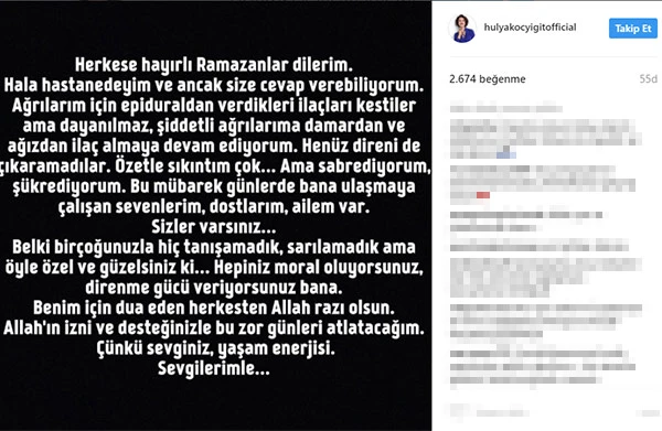 Türk sinemasının efsane ismi Hülya Koçyiğit, "Herkese hayırlı Ramazanlar dilerim. Hala hastanedeyim ancak size cevap verebiliyorum. Ağrılarım için epiduraldan verdikleri ilaçları kestiler ama dayılmaz, şiddetli ağrılarıma damardan ve ağızdan ilaç almaya devam ediyorum. Henüz direni de çıkaramadılar. Özetle sıkıntım çok ama sabrediyorum, şükrediyorum. Bu mübarek günlerde bana ulaşmaya çalışan sevenlerim, dostlarım, ailem var. Sizler varsınız. Hepiniz direnme gücü veriyorsunuz bana. Benim için dua eden herkesten Allah razı olsun. Allah'ın izni ve desteğinizle bu zor günleri atlatacağım. Çünkü sevginiz, yaşam enerjisi. Sevgilerimle" ifadelerini kullandı.