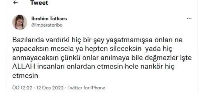 Twitter'dan paylaşımlar yapan İbo, "Bazıları da vardır ki hiçbir şey yaşatmamışsa onları ne yapacaksın mesela? Ya hepten sileceksin ya da hiç anmayacaksın! Çünkü onlar anılmaya bile değmezler. İşte Allah insanları onlardan etmesin hele nankör hiç etmesin!" mesajını paylaştı.
