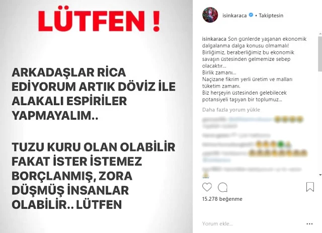 Instagram hesabından paylaşım yapan sanatçı şunları söyledi: "Arkadaşlar rica ediyorum artık döviz ile alakalı espriler yapmayalım. Tuzu kuru olan olabilir fakat ister istemez borçlanmış, zora düşmüş insanlar olabilir. Lütfen. Son günlerde yaşanan ekonomik dalgalanma dalga konusu olmamalı!