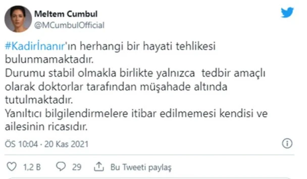 Ünlü oyuncu Meltem Cumbul da sosyal medya hesabından Kadir İnanır'ın durumu hakkında şu paylaşımda bulunmuştu: