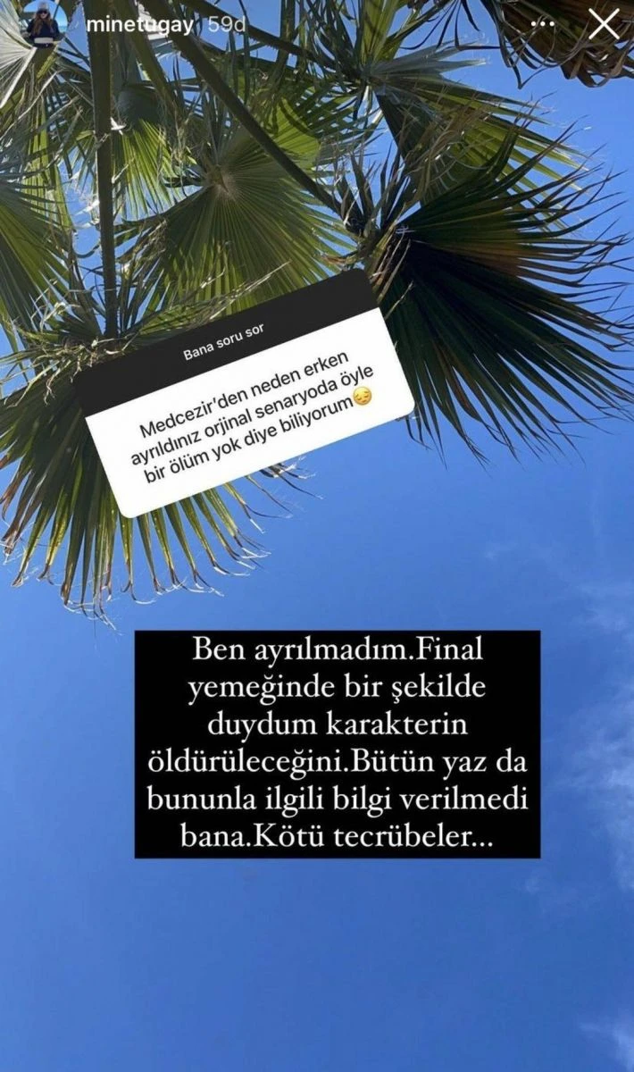 Mine Tugay, Instagram hesabından yapmış olduğu soru - cevap etkinliğinde diziden neden çıktığını yıllar sonra açıklamış oldu. Diziden ayrılmasını "bir nevi aforoz" diyen Mine Tugay'ın açıklamaları gündeme bomba gibi düştü.