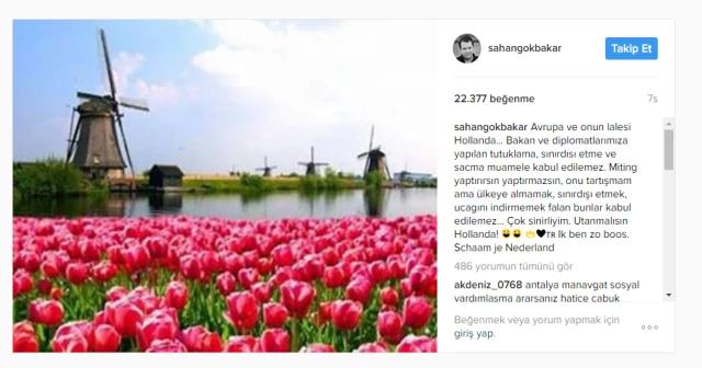 Komedyen Gökbakar, lale çiçeğinin olduğu bir fotoğraf karesine, ''Avrupa ve onun lalesi Hollanda... Bakan ve diplomatlarımıza yapılan tutuklama, sınırdısı etme ve sacma muamele kabul edilemez. Miting yaptırırsın yaptırmazsın, onu tartışmam ama ülkeye almamak, sınırdışı etmek, ucagını indirmemek falan bunlar kabul edilemez... Çok sinirliyim. Utanmalısın Hollanda!'' notunu düştü.