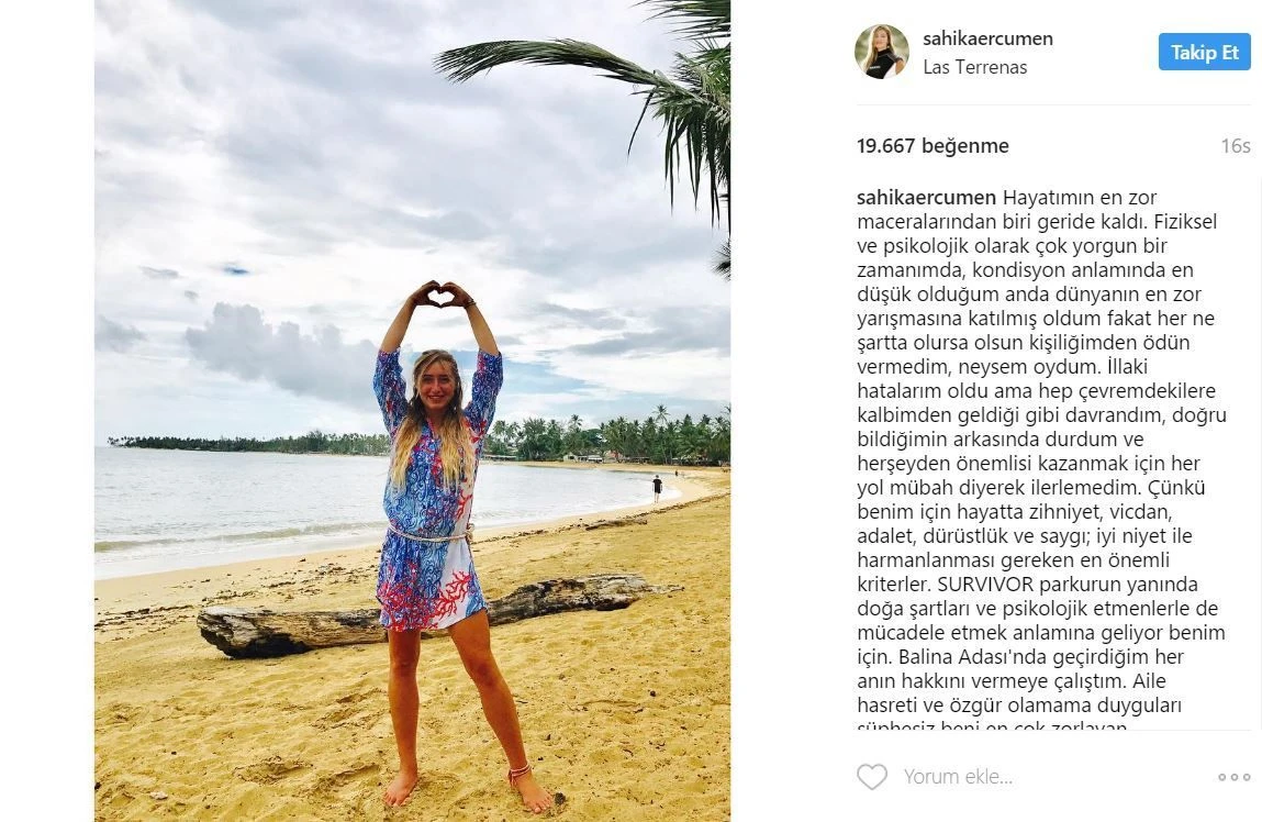 Şahika Ercümen, sosyal medya hesabı Instagram'dan Dominik Cumhuriyeti'nde çekilmiş bir fotoğrafını paylaşarak şu açıklamalarda bulundu: "Hayatımın en zor maceralarından biri geride kaldı. Fiziksel ve psikolojik olarak çok yorgun bir zamanımda, kondisyon anlamında en düşük olduğum anda dünyanın en zor yarışmasına katılmış oldum fakat her ne şartta olursa olsun kişiliğimden ödün vermedim, neysem oydum. İllaki hatalarım oldu ama hep çevremdekilere kalbimden geldiği gibi davrandım, doğru bildiğimin arkasında durdum ve herşeyden önemlisi kazanmak için her yol mübah diyerek ilerlemedim.