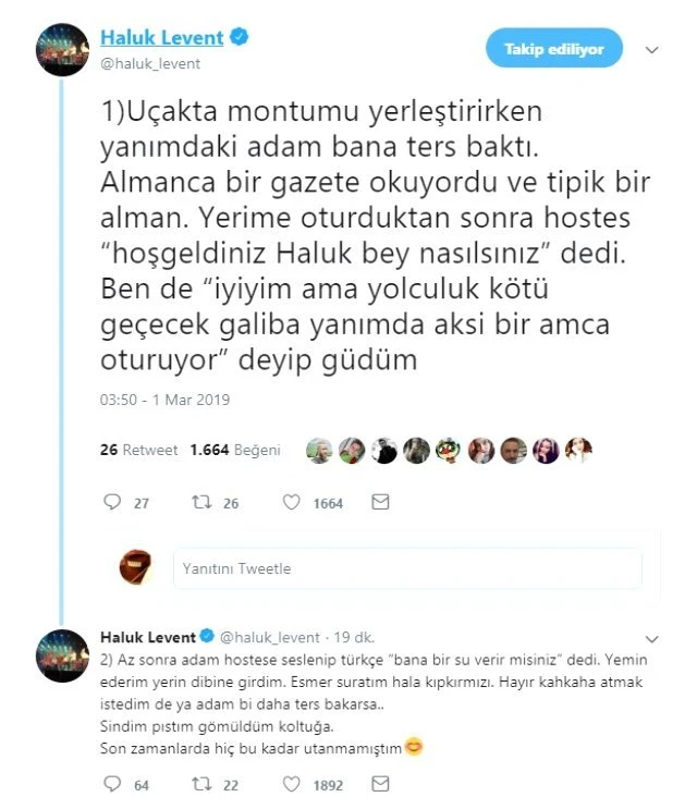 Ünlü şarkıcı Haluk Levent, uçak yolculuğu sırasında başına gelen trajikomik bir anısını anlattı. Twitter hesabından anısını paylaşan Levent, yolculuk esnasında yanında oturan kişinin turist olduğunu ve Türkçe bilmediğini düşünerek hostese komik bir şikayette bulunduğunu anlattı.