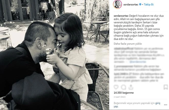 Serdar Ortaç şu sözlerle takipçilerinden kardeşine dua istedi: "Değerli hocalarım ne olur dua edin, Allah'ım sen bağışlayansın, sen şifa verensin, küçük kardeşim Serkan'ı bize bağışla yarabbim.