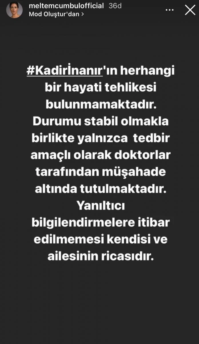 İnanır’ın tedavisi devam ederken, sanatçı arkadaşı Meltem Cumbul sosyal medya hesabından sanatçının sağlık durumuyla ilgili açıklama yaptı. Cumbul açıklamasında, “Kadir İnanır’ın herhangi bir hayati tehlikesi bulunmamaktadır. Durumu stabil olmakla birlikte yalnızca tedbir amaçlı doktorlar tarafından müşahede altında tutulmaktadır. Yanıltıcı bilgilere itibar edilmemesi kendisinin ve ailesinin ricasıdır” ifadelerine yer verdi.