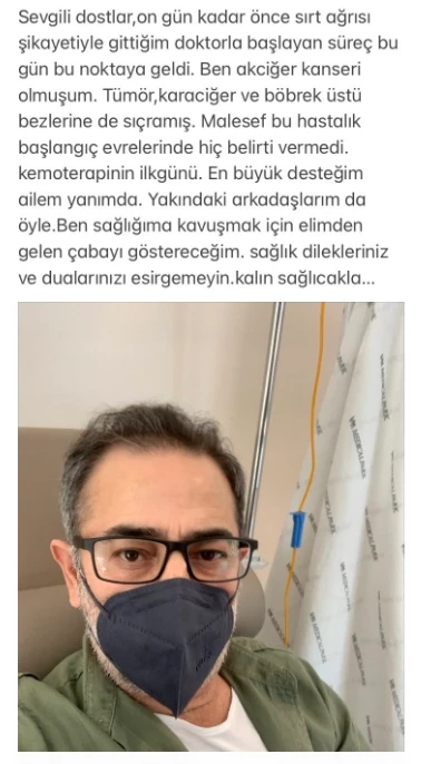 "Sevgili dostlar, on gün kadar önce sırt ağrısı şikayetiyle gittiğim doktorla başlayan süreç bugün bu noktaya geldi. Ben Akciğer Kanseri olmuşum. Tümör, karaciğer ve böbrek üstü bezlerine de sıçramış. Maalesef bu hastalık başlangıç evrelerinde hiç belirti vermedi. Kemoterapinin ilk günü. En büyük desteğim ailem yanımda. Yakındaki arkadaşlarım da öyle. Ben sağlığıma kavuşmak için elimden gelen çabayı göstereceğim. Sağlık dilekleriniz ve dualarınızı esirgemeyin. Kalın sağlıcakla..."