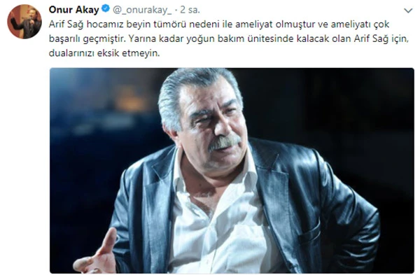 Ses sanatçısı Onur Akay, usta sanatçının sağlık durumuna ilişkin açıklama yaptı. Onur Akay, twitter hesabından, "Arif Sağ hocamız beyin tümörü nedeni ile ameliyat olmuştur ve ameliyatı çok başarılı geçmiştir. Yarına kadar yoğun bakım ünitesinde kalacak olan Arif Sağ için dualarınızı eksik etmeyin" paylaşımını yaptı.