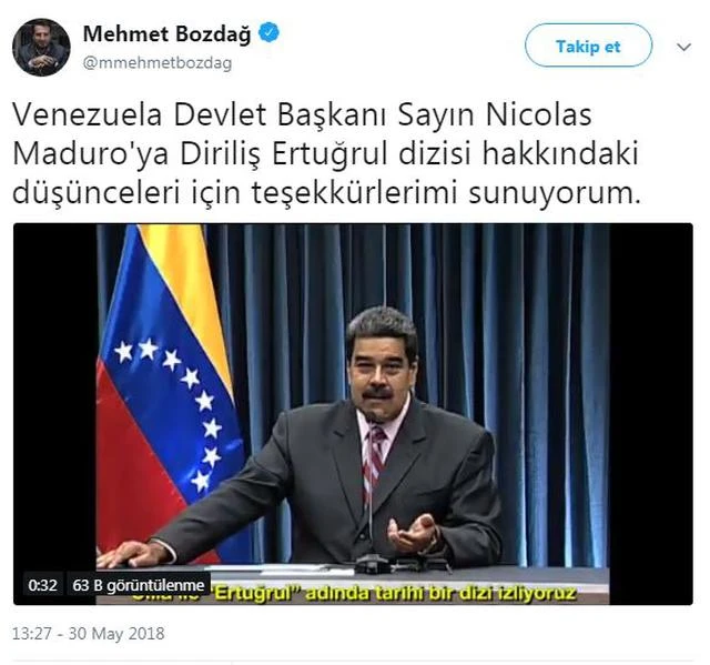 Diriliş Ertuğrul dizisinin yapımcısı Mehmet Bozdağ da Twitter hesabından yayınladığı mesajda Maduro'ya, dizi hakkındaki görüşlerinden dolayı teşekkür etti.