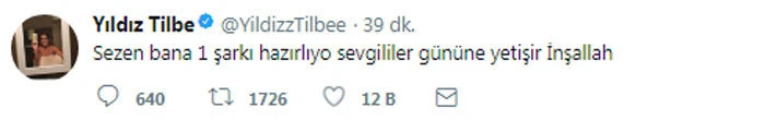 Yıldız Tilbe, müjdeyi Twitter'dan verdi. Sezen Aksu'nun kendisi için bir şarkı hazırladığını açıklayan Yıldız Tilbe, ''Sevgililer Günü'ne yetişir inşallah'' dedi.