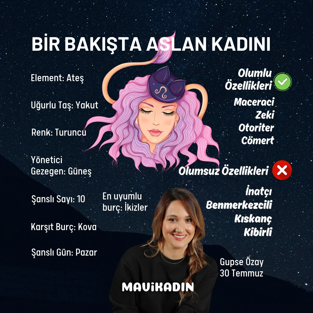 Aslan burcu kadını, Güneş’in etkisiyle doğuştan lider, gururlu, cesur ve cömert bir kişiliğe sahiptir. Aslan burcu kadını özellikleri, hayatın her alanında kendini gösterir ve onu diğer burçlardan ayırır. İlişkilerde tutkulu, sadık ve koruyucu olan Aslan burcu kadını, iş hayatında da başarılı, otoriter ve yenilikçidir. Peki, Aslan burcu kadını nasıl biridir? Aslan burcu kadınının olumlu ve olumsuz yönleri nelerdir? Aslan burcu kadını hangi burçlarla uyumludur? Aşk, kariyer, sağlık konularında neler yaşar? Aslan burcu kadını özelliklerini A’dan Z’ye Mavu Kadın editörü yazdı.
