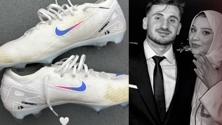 Çocuk Gelişimi mezunu olan müstakbel eşi Ceren Azak’ın ismini kramponuna yazdıran futbolcu Kerem Aktürkoğlu bu hareketi ile sosyal medyayı salladı.