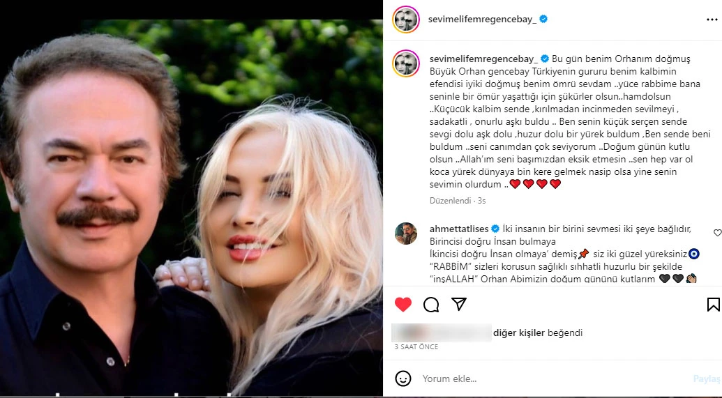 Bugün benim Orhan’ım doğmuş. Büyük Orhan Gencebay, Türkiye’nin gururu benim kalbimin efendisi… İyi ki doğmuş benim ömrüm, sevdam. Yüce Rabbime bana seninle bir ömür yaşattığı için şükürler olsun. Hamdolsun… Küçücük kalbim sende, kırılmadan incinmeden sevilmeyi, sadakatli, onurlu aşkı buldu. Ben senin küçük serçen sende sevgi dolu, aşk dolu, huzur dolu bir yürek buldum. Ben sende beni buldum. Seni canımdan çok seviyorum. Doğum günün kutlu olsun. Allah’ım seni başımızdan eksik etmesin. Sen hep var ol koca yürek, dünyaya bin kere gelmek nasip olsa yine senin Sevim’in olurdum.