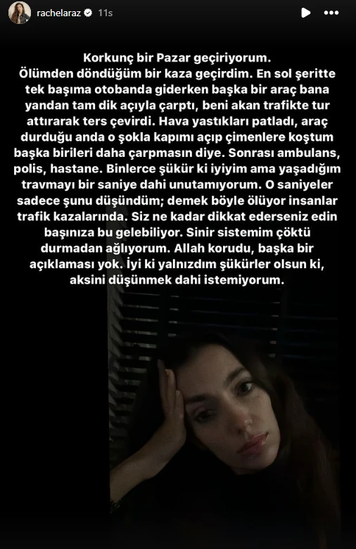 “Korkunç bir Pazar geçiriyorum. Ölümden döndüğüm bir kaza geçirdim” diyen Araz, yaşadıklarını şu sözlerle dile getirdi: