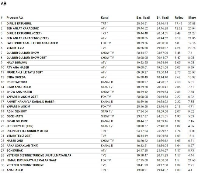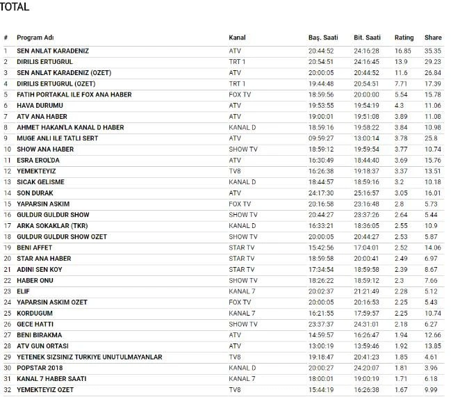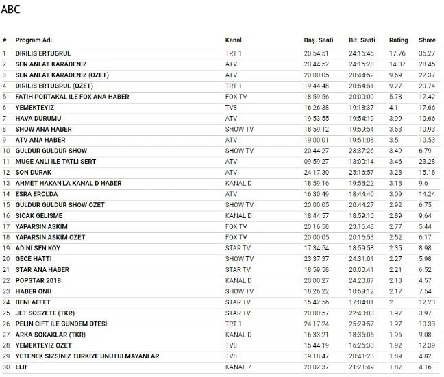 28 Mart Çarşamba reyting sonuçları açıklandı. Haberimiz içerisinden ulaşabilirsiniz. Geçen hafta Total puan türünde Sen Anlat Karadeniz 34.61 share alarak birinci, Diriliş Ertuğrul 30.41 share alarak ikinci oldu. AB puan türünde 37.69 share alan Diriliş Ertuğrul birinci sırada, 25.52 share alan Sen Anlat Karadeniz ikinci sırada yer aldı.
