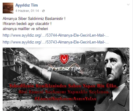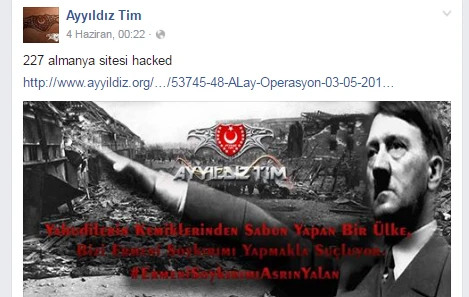 Daha önce bir çok ülkeyi hedefine alan Ayyıldız Tim, Almanya’nın 1915 olaylarını ‘soykırım’ olarak niteleyen skandal tasarıyı kabul etmesinin ardından harekete geçti. Ayyıldız Tim Almanya için büyük öneme sahip bir çok siteyi hacklerken sitelere şu mesajı bıraktı: 'Ayyıldız Tim siber ordusu tarafından hacklendiniz, Türk'le dost ol düşman olma'. Ayrıca Ayyıldız Tim hacklediği 250'yi aşkın siteyi sosyal medya hesaplarından da duyurdular. Sosyal medyadan yayınlanan mesaj ise dikkat çekiciydi.