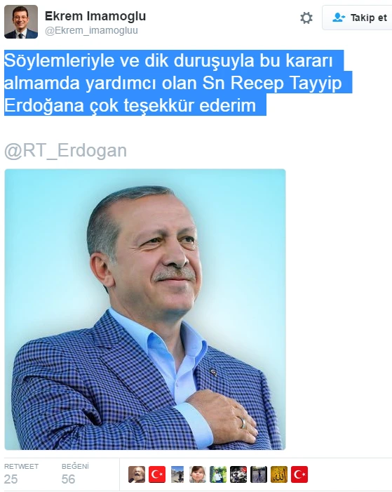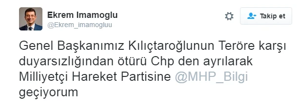 Ekrem İmamoğlu, Twitter hesabından peş peşe takipçilerini şaşırtan tweetler attı. İmamoğlu adresinden: 'Genel Başkanımız Kılıçdaroğlunun Teröre karşı duyarsızlığından ötürü CHP'den ayrılarak Milliyetçi Hareket Partisine geçiyorum' diye yazınca sosyal medya sallandı. Bir sonraki tweetinde ise Cumhurbaşkanı Erdoğan'a yer veren İmamoğlu: 'Söylemleriyle ve dik duruşuyla bu kararı almamda yardımcı olan Sn Recep Tayyip Erdoğana çok teşekkür ederim' dedi. Son olarak: 'Chp'li olarak hiçbir zaman yazamadım yazdırmadılar ama KAHROL PKK - KAHROL FETO' diyen İmamoğlu hakkındaki gerçek kısa sürede ortaya çıktı.