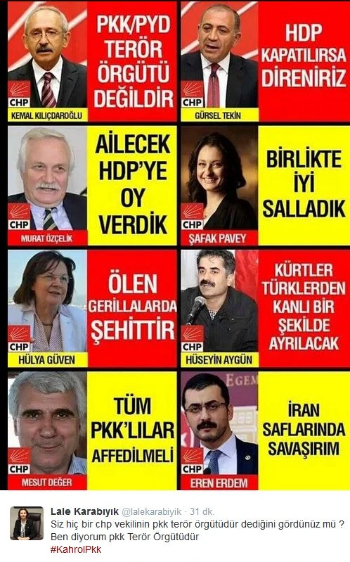 CHP Sosyal Politikalarından Sorumlu Genel Başkan Yardımcısı Bursa Milletvekili, Plan ve Bütçe Komisyonu Üyesi Prof. Dr. Lale Karabıyık'ın twitter hesabından #KahrolPkk etiketiyle bir resim paylaşıldı. Paylaşılan resimde partisinin Genel Başkanı Kemal Kılıçdaoğlu olmak üzere: Gürsel Tekin, Murat Özçelik, Şafak Pavey, Hülya Güven, Hüseyin Aygün, Mesut Değer, Eren Erdem gibi şuan CHP'de görevli ve daha önce görev yapmış isimlere ve PKK-HDP hakkında skandal sözlerine yer verdi. CHP'de durum böyle iken Lale Karabıyık'ın hesabından PKK-HDP'yi kötüleyen tweetler atılması herkesi şaşırttı. Gerçek ise daha sonra ortaya çıktı. Pek çok kez skandal davranışlarda bulunan HDP ve CHP'li milletvekillerinin hesaplarına el koyan Ayyıldız Tim Lale Karabıyık'ın resmi twitter hesabına el koydu. Ayyıldız Tim ele geçirdiği adresten bir çok tweet atarak Lale Karabıyık'ı takip edenlere ulaştırdı.