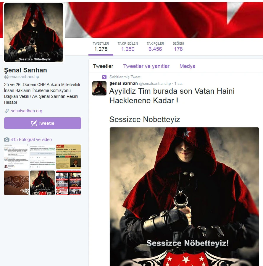 Ayyıldız Tim Lale Karabıyık'ın hesabının ardından 25 ve 26. Dönem CHP Ankara Milletvekili İnsan Haklarını İnceleme Komisyonu Başkan Vekili, Avukat Şenal Sarıhan'ın Resmi Hesabını hackledi ve bir de mesaj bıraktı.
