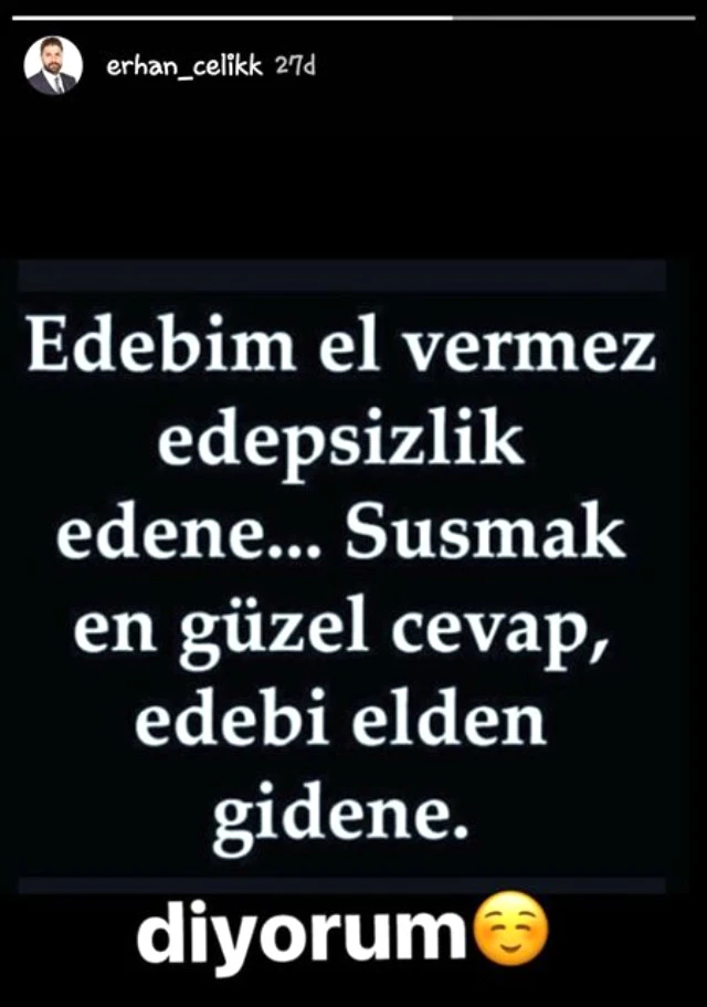 Erhan Çelik, sosyal medya hesabından "Edebim el vermez edepsizlik edene... Susmak en güzel cevap edebi elden gidene" notunu paylaşarak, Ergen'e imalı bir göndermede bulundu.