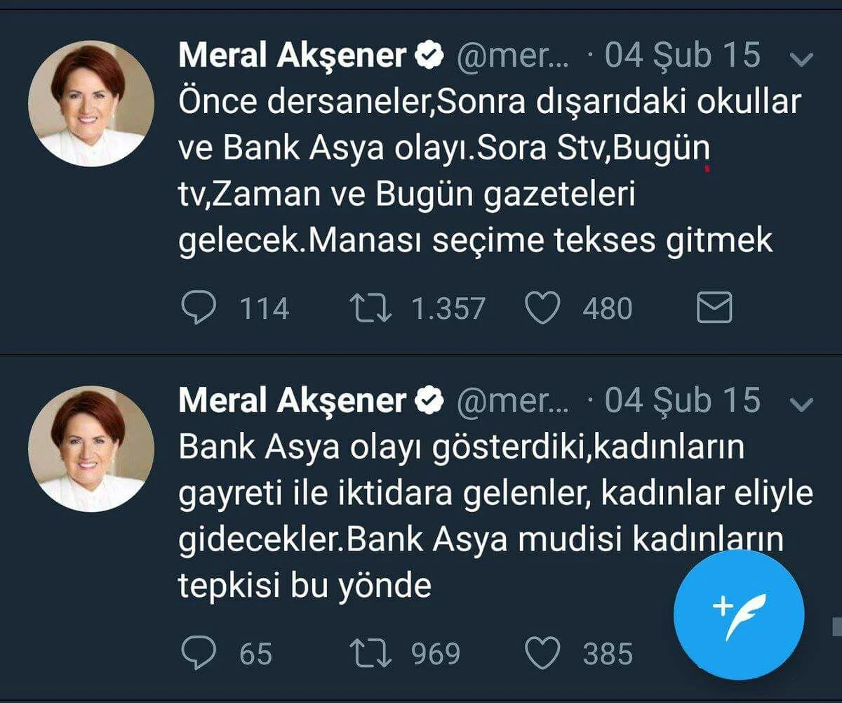 Nitekim Meral Akşener’in Bank Asya’ya el konulmasına yukarıdaki tweet’inde görüleceği üzere kadınların tepki göstereceğini yazmasının ardından FETÖ’nün organize ettiği bir grup kadın Bank Asya genel merkezine gidip toplanmıştı bir akşam.