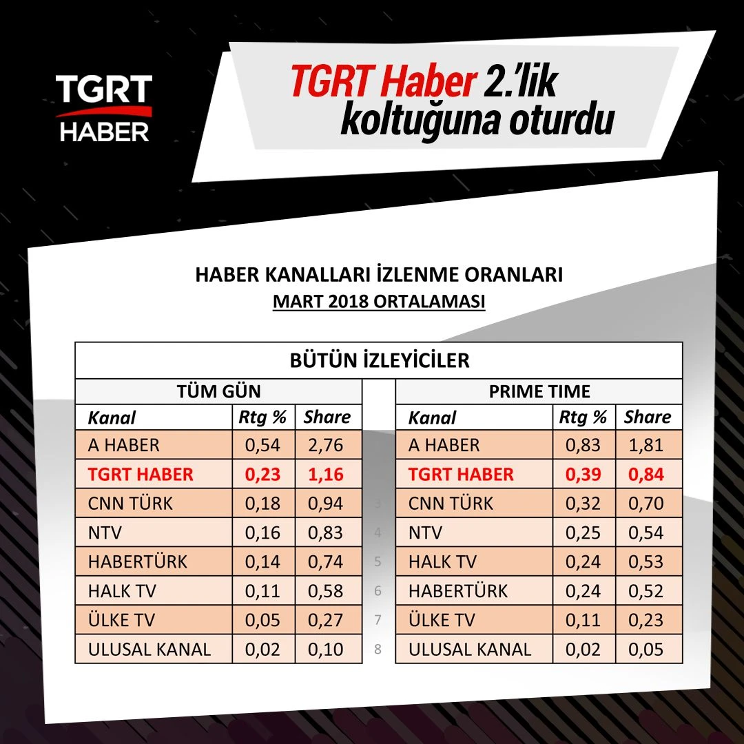 TGRT Haber, bir sabah klasiği haline gelen ‘Medya Kritik’ dışında bütün programlardan vazgeçip, sürekli canlı ve 7/24 sadece haber yayınına başladı. Bu hamlesiyle haber yarışında büyük bir atağa kalkan TGRT Haber 2018 yılına da bomba gibi bir başlangıç yaptı. Ve şubat ayında Türkiye’nin en çok izlenen haber kanalları sıralamasında 2. sıraya yükseldi. TGRT Haber, Türk Silahlı Kuvvetlerinin Suriye’deki terör örgütlerine yönelik başlattığı Zeytin Dalı Harekatı’nda da başarılı yayınlarıyla öne çıktı. İhlas Haber Ajansının desteğiyle operasyon bölgesinden yapılan yayınlar takdirle karşılandı. Bir yandan da haber merkezi ve ekran kadrosunu güçlendiren TGRT Haber, reytinglerini hızla artırdı. Türkiye’nin en çok seyredilen haber kanalları sıralamasında, Şubat’tan sonra Mart ayında da ikinciliği yine TGRT Haber kazandı.