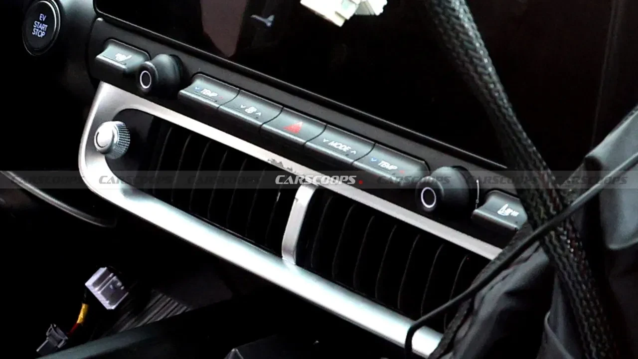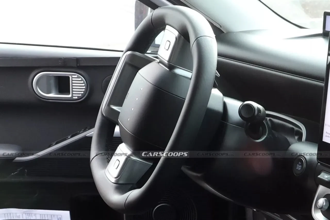 Kokpit tasarımı Hyundai’nin bugüne kadar kullandıklarından oldukça farklı. Ioniq 5 ve 6’daki birleşik ekran yerine, ön camın altına yerleştirilen ince bir dijital gösterge paneli ve konsolun üstüne oturtulmuş büyük bir tablet ekran dikkat çekiyor.