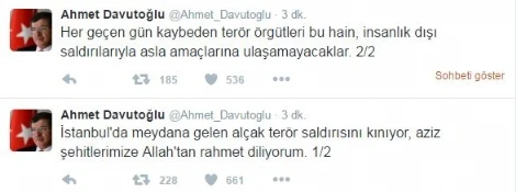 Eski Başbakan ve AK Parti Konya Milletvekili Ahmet Davutoğlu, İstanbul Vezneciler'de düzenlenen terör saldırısıyla ilgili, resmi Twitter hesabı üzerinden açıklama yaptı.