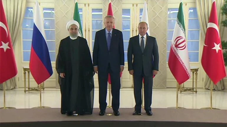 Cumhurbaşkanı Recep Tayyip Erdoğan'ın ev sahipliğindeki Türkiye-Rusya-İran Üçlü Zirvesi öncesinde, Rusya Federasyonu Devlet Başkanı Vladimir Putin ve İran Cumhurbaşkanı Hasan Ruhani'nin katılımıyla üç ülkenin bayrakları önünde aile fotoğrafı çekildi.