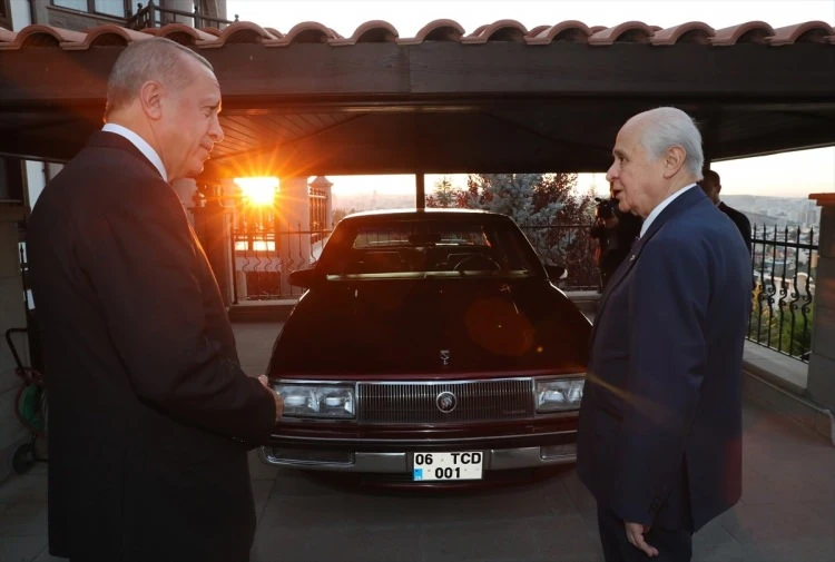 Bir süre önce üst solunum yolu enfeksiyonu nedeniyle rahatsızlık geçiren Bahçeli, Cumhurbaşkanı Erdoğan'a, kendisini ziyareti sırasında bahçesindeki klasik otomobilini gösterdi.