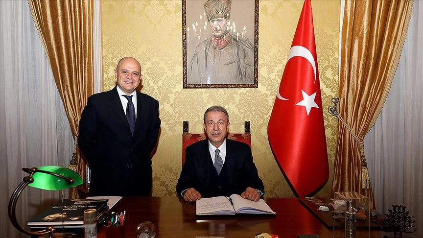 Türkiye’nin Roma Büyükelçiliğini ziyaret eden Akar, Büyükelçilik Şeref Defteri’ni imzaladı, Büyükelçi Esenli ile görüştü.
