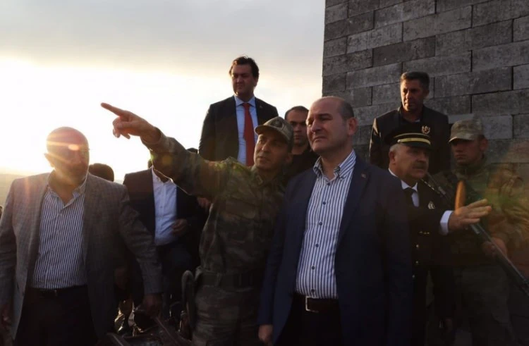 İçişleri Bakanı Süleyman Soylu, terör örgütü PKK mensuplarınca saldırı düzenlenen Tendürek Dağı Gökçebulak köyü mevkisindeki korucu noktalarında incelemelerde bulundu.