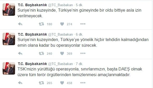 Başbakan Binali Yıldırım, attığı tweet'lerde şu ifadelere yer verdi;"TSK’mızın yürüttüğü operasyonla, sınırlarımızın, başta DAEŞ olmak üzere tüm terör örgütlerinden temizlenmesi amaçlanmaktadır.Suriye’nin kuzeyinden, Türkiye’ye yönelik hiçbir tehdidin kalmadığından emin olana kadar bu operasyonlar sürecek. Suriye’nin kuzeyinde, Türkiye’nin güneyinde bir oldu bittiye asla izin verilmeyecek."