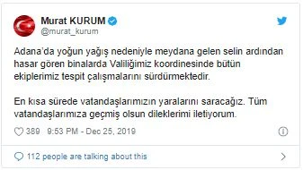 "Adana'da yoğun yağış nedeniyle meydana gelen selin ardından hasar gören binalarda Valiliğimiz koordinesinde bütün ekiplerimiz tespit çalışmalarını sürdürmektedir. En kısa sürede vatandaşlarımızın yaralarını saracağız. Tüm vatandaşlarımıza geçmiş olsun dileklerimi iletiyorum."