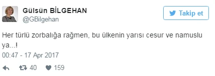 CHP Ankara Milletvekili Gülsün Bilgehan, referandum sonuçlarının netleşmesiyle birlikte sosyal medya hesabı üzerinden tartışmalara konu olacak bir açıklamada bulundu.