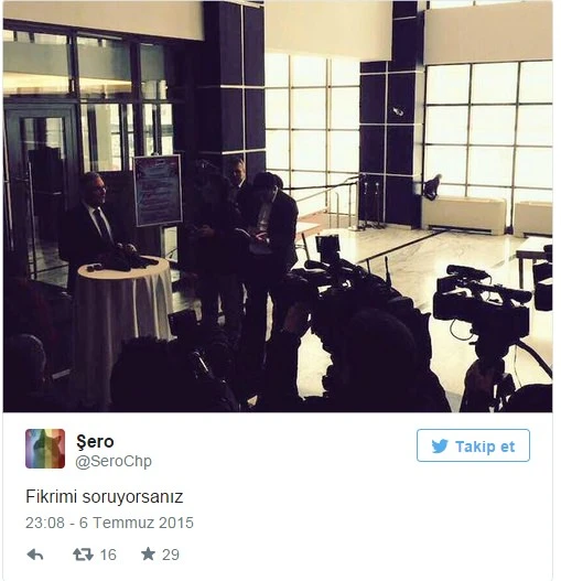 Ardından, aynı hesapta bir fotoğraf paylaşıldı. 'Fikrimi soruyorsanız' notuyla paylaşılan fotoğraf, CHP Genel Merkezi'nde basın açıklaması yapan Deniz Baykal'a aitti. Fotoğrafta, Baykal açıklama yaparken, Şero'nun ise arkası dönük bir vaziyette pencereden dışarı baktığı görülüyor.