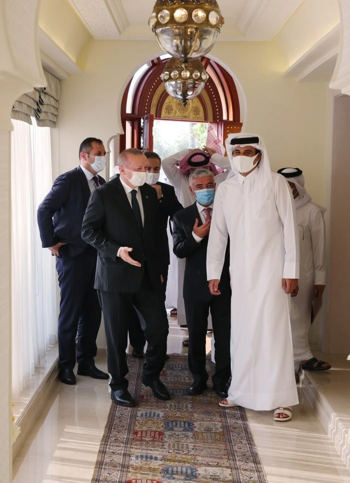 Erdoğan ile Hazine ve Maliye Bakanı Berat Albayrak, Gençlik ve Spor Bakanı Mehmet Kasapoğlu, Milli Savunma Bakanı Hulusi Akar, MİT Başkanı Hakan Fidan, Cumhurbaşkanlığı İletişim Başkanı Fahrettin Altun ve Cumhurbaşkanlığı Sözcüsü İbrahim Kalın da Katar'a geldi.