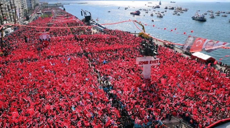 Cumhurbaşkanı Erdoğan, İzmir'de düzenlenen mitingdeki konuşmasında "CHP'nin Konya milletvekili çıkmış evet verenleri İzmir'den denize dökeceklerini söylüyor. Bak burada evetçiler, haydi gel kimi denize döküyorsun görelim" dedi.