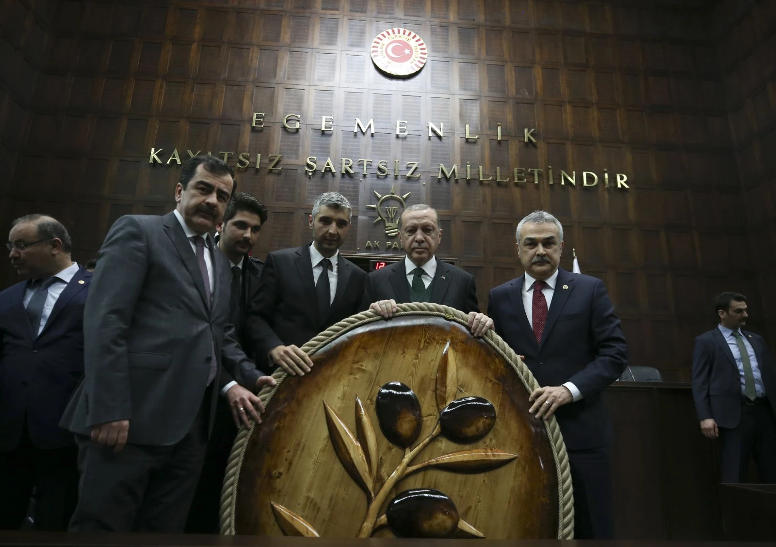 Cumhurbaşkanı ve AK Parti Genel Başkanı Recep Tayyip Erdoğan, partisinin TBMM Grup Toplantısı'na katıldı. Toplantı sonrası Cumhurbaşkanı Erdoğan'a, AK Parti Aydın Milletvekili Mustafa Savaş (sağda), tarafından ahşap oymalı zeytin dalı tablosu hediye edildi.