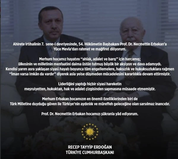 Erbakan ile çekilen fotoğrafının yer aldığı paylaşımda Cumhurbaşkanı Erdoğan, "Ahirete irtihalinin 7. seneidevriyesinde, 54. Hükümetin Başbakanı Prof. Dr. Necmettin Erbakan'a yüce Mevla'dan rahmet ve mağfiret diliyorum." ifadesine yer verdi.