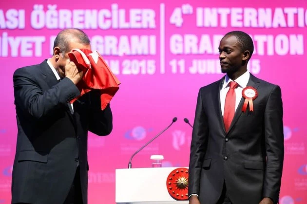 Cumhurbaşkanı Recep Tayyip Erdoğan, ATO Congresium'da düzenlenen 4.Uluslararası Öğrenciler Mezuniyet Töreni'nde kendisine hediye edilen bayrağı üç kez öperek alnına koydu. Erdoğan'a bayrağı hediye eden ise Erciyes Üniverseti'nde öğrenim gören Ugandalı Cemil idi. Ugandalı terzi annenin evde dikip Türkiye'ye gönderdiği nizami olmayan bu hediye bayrağın ardında insanı hüzünlendiren bir hikaye yatıyor. Türkiye'de "Türkiye Bursları" ile okuyan 4 bin yabancı öğrenci bu yıl mezun oluyor. Bu öğrenciler içinde Türki Cumhuriyetler ile yoksul Afrika ülkelerinden gelenler çoğunluğu oluşturuyor. Cumhurbaşkanı Erdoğan'ın da katıldığı törende, 4 bin dolayında öğrenci mezuniyet keplerini fırlattı. Yabancı öğrencilerden oluşan koronun seslendirdiği Çanakkale Türküsü salonda duygusal bir atmosfer oluşturdu. Sık sık gözlerin yaşardığı törende Ugandalı Cemil'in hikayesi de, kısa bir filmle anlatıldı: