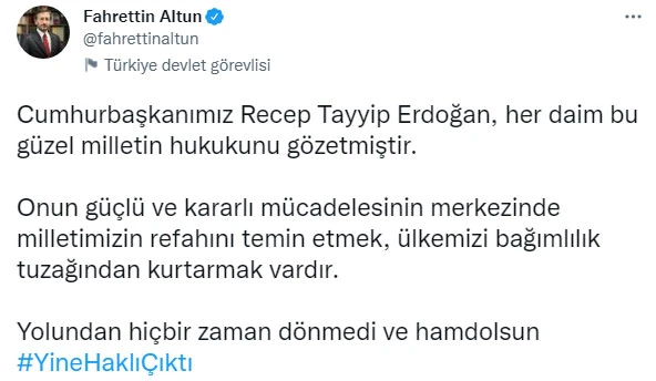 İletişim Başkanı Fahrettin Altun, Cumhurbaşkanı Erdoğan için "Hamdolsun yine haklı çıktı" sözleriyle paylaşımda bulundu.