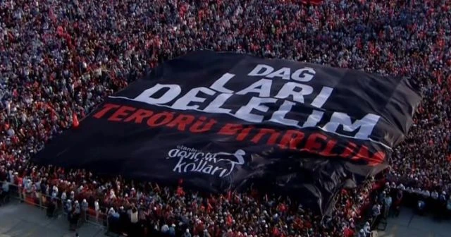 Cumhurbaşkanı Erdoğan'ın konuşması sırasında Ak Parti İstanbul Gençlik Kolları tarafından 'Dağları delelim terörü bitirelim' yazılı pankart açıldı