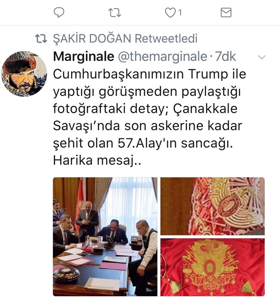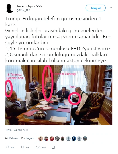 Twitter kullanıcıları, paylaşılan fotoğraftaki detayları ''15 Temmuz'un sorumlusu FETO'yu istiyoruz, Osmanlı'dan sorumlulugumuzdaki halklari korumak icin silah kullanmaktan cekinmeyiz.'' şeklinde yorumladı.