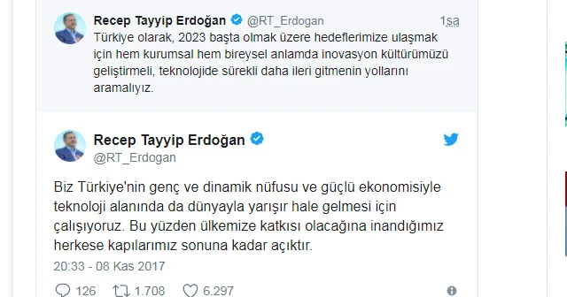 Cumhurbaşkanı Recep Tayyip Erdoğan, Twitter'daki hesabından yaptığı değerlendirmede, Türkiye olarak başta 2023 olmak üzere hedeflere ulaşmak için hem kurumsal, hem bireysel anlamda inovasyon kültürünü geliştirmek, teknolojide sürekli daha ileri gitmenin yollarını aramak gerektiğine vurgu yaptı.