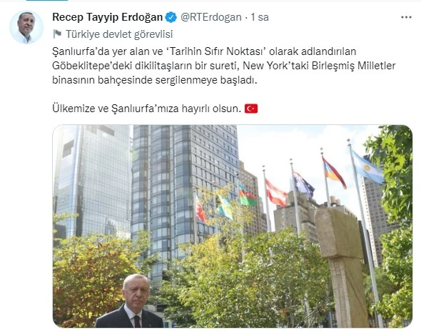 Cumhurbaşkanı Recep Tayyip Erdoğan, New York'ta bulunan Birleşmiş Milletler binası bahçesindeki Göbeklitepe'deki dikilitaşın replikasına ilişkin sosyal medya üzerinden paylaşım yaparak ülkeye ve Şanlıurfa'ya hayırlı olmasını diledi.