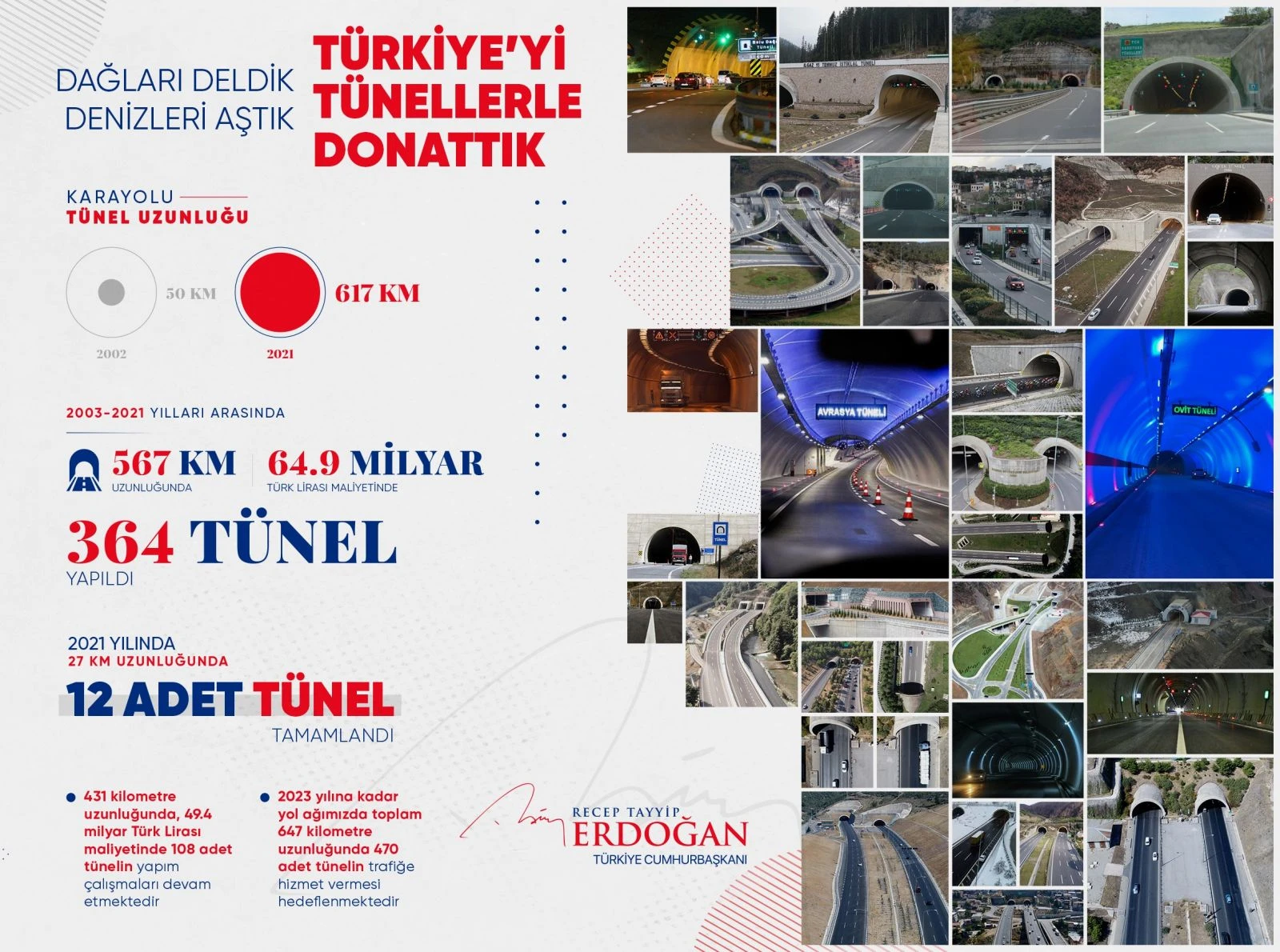 "Dağları deldik, denizleri aştık. Türkiye'yi tünellerle donattık." başlıklı grafikte ise 2002 yılında 50 kilometre olan karayolu tüneli uzunluğunun 2021'de 617 kilometreye ulaştığı bilgisi yer aldı. Grafikte ayrıca 2003-2021 yılları arasında 567 kilometre uzunluğunda ve 64,9 milyar Türk lirası maliyetle 364 tünelin yapıldığı belirtildi.