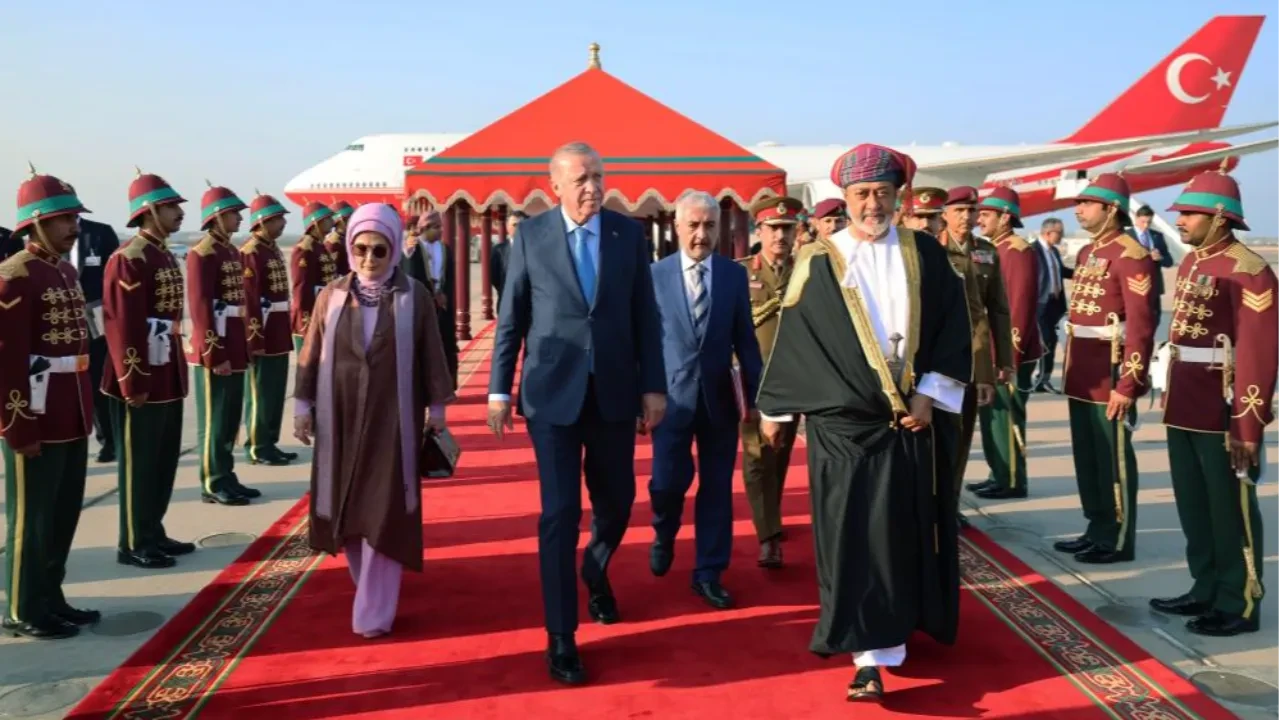 Katar Emiri Şeyh Al Thani ile Türkiye-Katar Yüksek Stratejik Komite 11. Toplantısı'na başkanlık eden Cumhurbaşkanı Erdoğan, Katar'ın ardından Umman'a geldi. Cumhurbaşkanı Erdoğan, Özel Sultanlık Havaalanı'nda Umman Sultanı Heysem bin Tarık ve Türkiye'nin Maskat Büyükelçisi Muhammet Hekimoğlu ve elçilik personeli tarafından karşılandı. Erdoğan, havalimanının ardından Al-Alam Sarayı'na geçti.