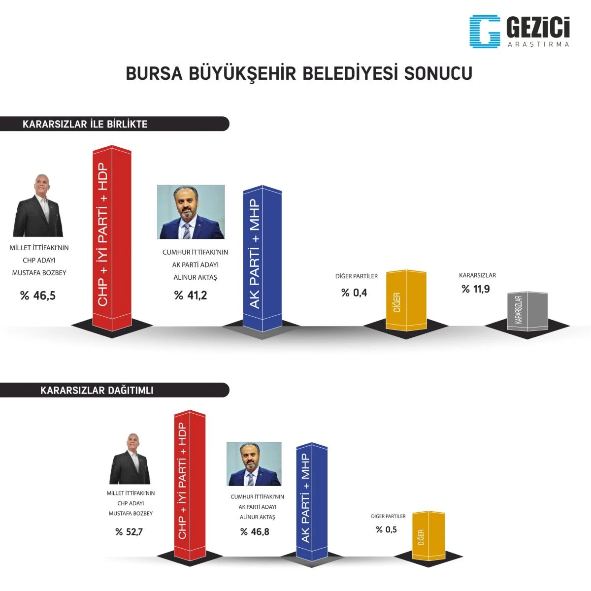Bursa’da CHP’li Mustafa Bozbey’in 46.5 oranında oy aldığı görülüyor. AK Partili Alinur Aktaş’ın oy oranı ise yüzde 41.2.