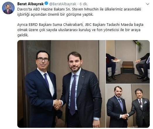 Bakan Albayrak Twitter'dan yaptığı açıklamada, "Davos'ta ABD Hazine Bakanı Sn. Steven Mnuchin ile ülkelerimiz arasındaki işbirliği açısından önemli bir görüşme yaptık. Ayrıca EBRD Başkanı Suma Chakrabarti, JBIC Başkanı Tadashi Maeda başta olmak üzere çok sayıda uluslararası kuruluş ve fon yöneticisi ile bir araya geldik." mesajını verdi.